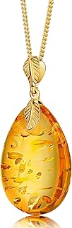 PEORA Genuine Baltic Amber Pendant Necklace, Sterling Silver, Floating Oval Shape Design, Cognac Color, 100% Natural from Baltic Region